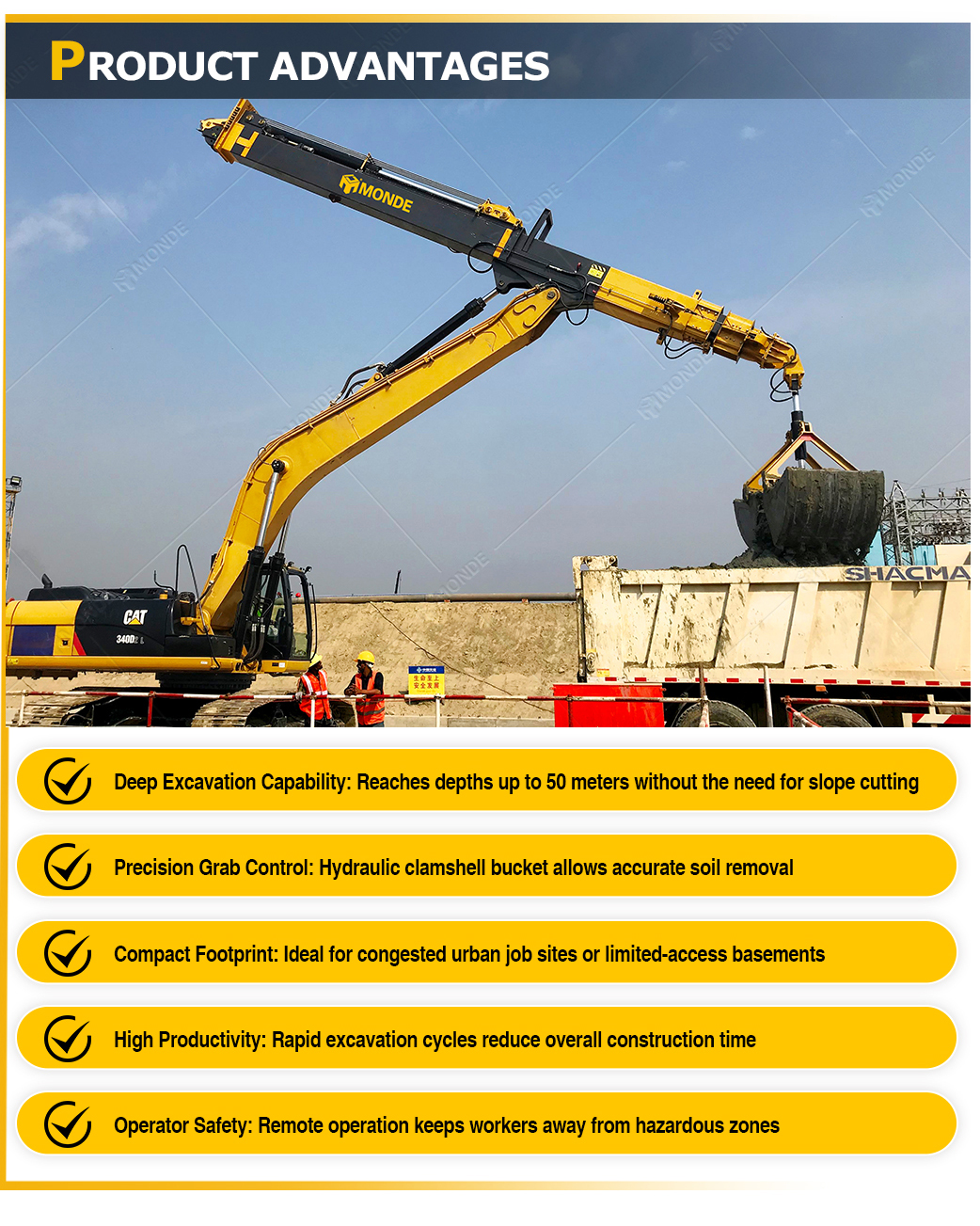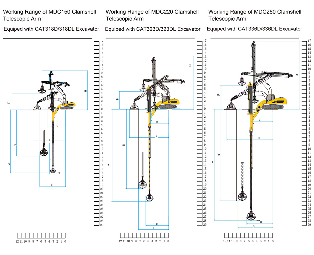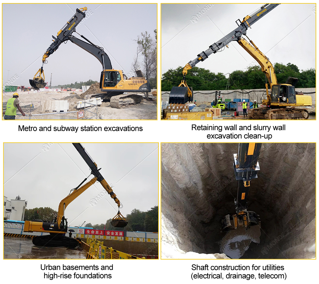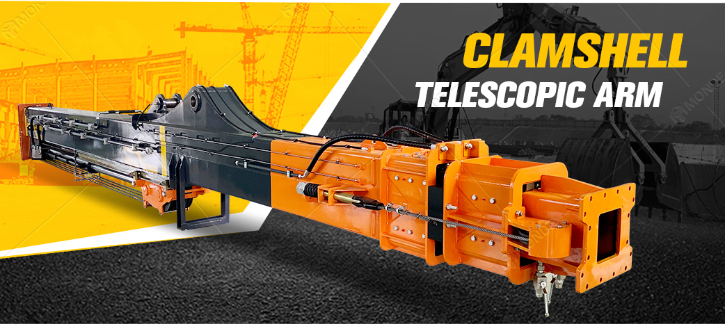 The Clamshell Telescopic Arm is engineered for confined and demanding worksite conditions, equipped with a robust telescopic arm and boom, and a heavy-duty clamshell bucket. Delivering exceptional reach, control and productivity the ability to perform in confined spaces such as urban foundations, tunneling and deep pit projects make it the ideal choice in simplifying complex tasks.